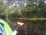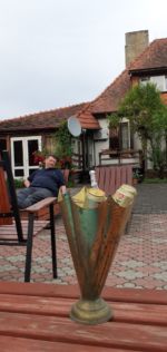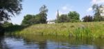 Rzeczony Przyjaciel pana z wąsami stał jakiś smutny po brzuch w wodzie i patrzył trochę znudzonym wzrokiem to na nasze kajaki to na swego pana unoszącego się jak spławik na Noteci. Jeszcze jeden zakręt i z daleka widzimy szpiczastą wieżę kościoła w Trzebiczu.